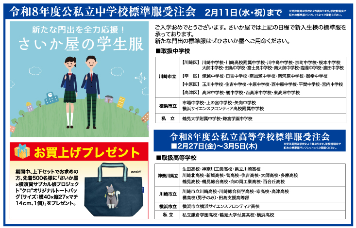 ■学生服 営業時間:午前10時~午後6時 ご成長に合わせた修理等のアフターサービスもございます。 ご進学やご進級等の準備はさいか屋へお越しくださいませ。 【3年間アフターサービス】 上衣の袖出し、スラックス・スカートの丈出しのお修理は無料にて承ります。 ※サービス内容は学校により異なります。詳細は店頭にお問合せくださいますようお願い申し上げます。 ![]() |