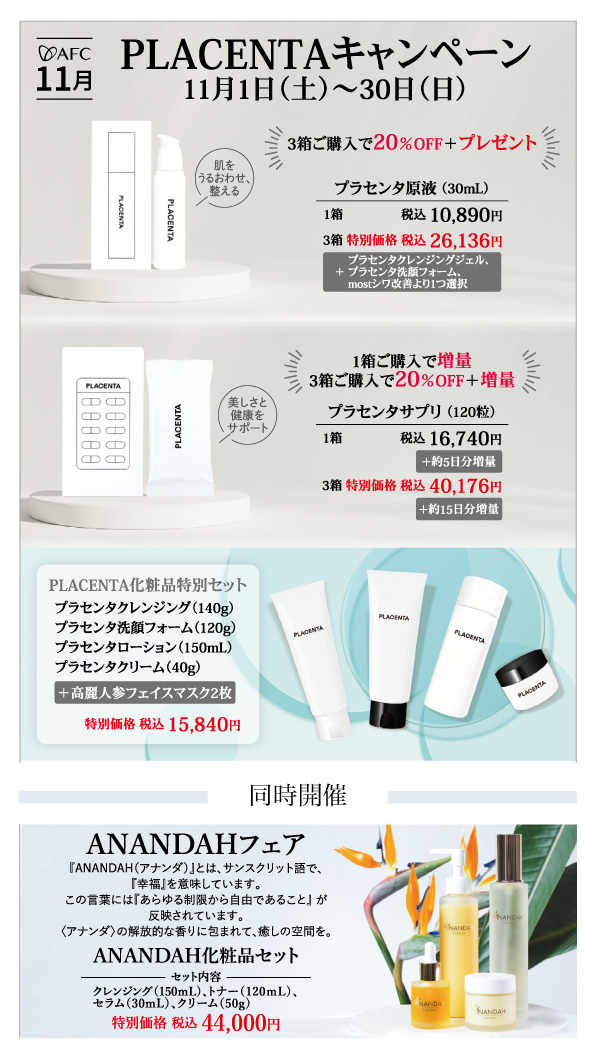 | ■11月1日(土)~11月30日(日) プラセンタキャンペーン 肌にうるおいをあたえ、美しさと健康をサポートするプラセンタ。 毎日を楽しく、自分らしく。 キャンペーン中は、3箱ご購入で20%OFF+増量! 【同時開催】アナンダフェア | |