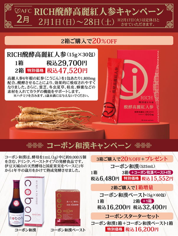 | 〈2月のおすすめ〉 RICH醗酵高麗紅人参キャンペーン ■2月1日(日)~2月28日(土) ※2月17日(火)は定休日とさせていただきます。 ![]() |