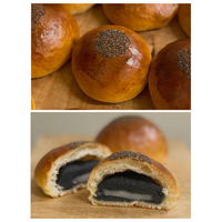 | 黒胡麻の餡と、求肥のもちもちが美味しい新作パン。温かいお茶と一緒にいかがでしょうか♪ ●黒ごまあんぱん 税込227円 | ![]() ※写真はイメージです。 |