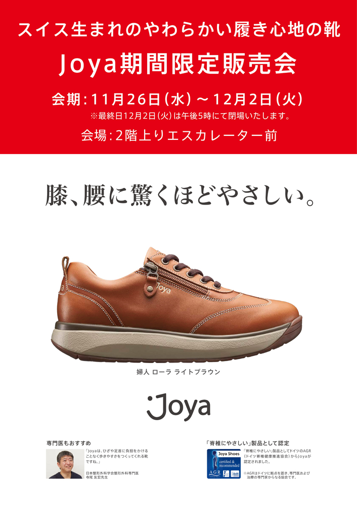 | ■11月26日(水)~12月2日(火) ■2階 上りエスカレーター前 スイス生まれのやわらかい履き心地の靴 膝、腰に驚くほどやさしいJoyaの靴を期間限定にてご紹介いたします。 ※最終日12月2日(火)は午後5時にて閉場いたします。 |