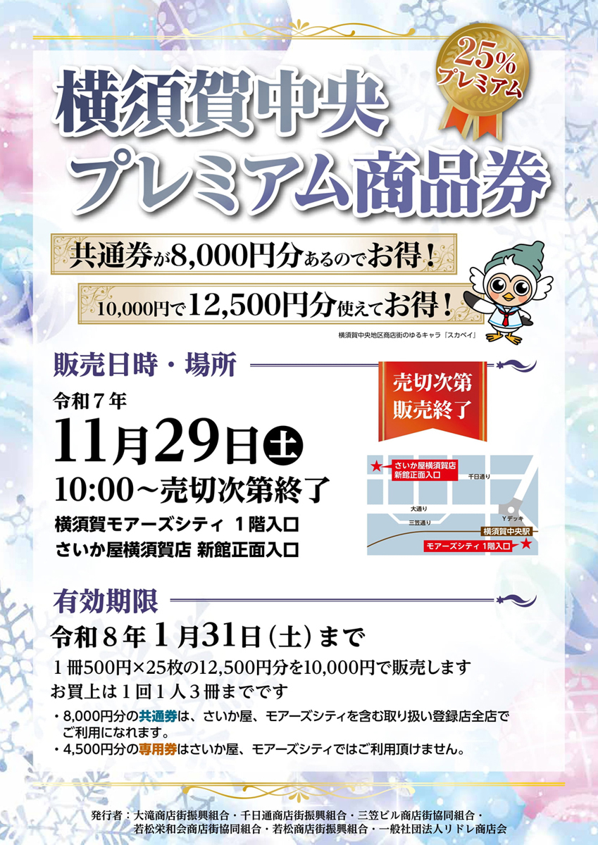 | ■2026年1月31日(土)まで さいか屋横須賀店にて横須賀中央プレミアム商品券がご利用いただけます。 ぜひご利用ください。 ※ご利用可能期間は2026年1月31日(土)まで。 なお、ご利用いただける券種は「共通券」のみです。 ※一部店舗、商品にはご利用いただけません。 詳しくは売場係員にお尋ねくださいませ。 |